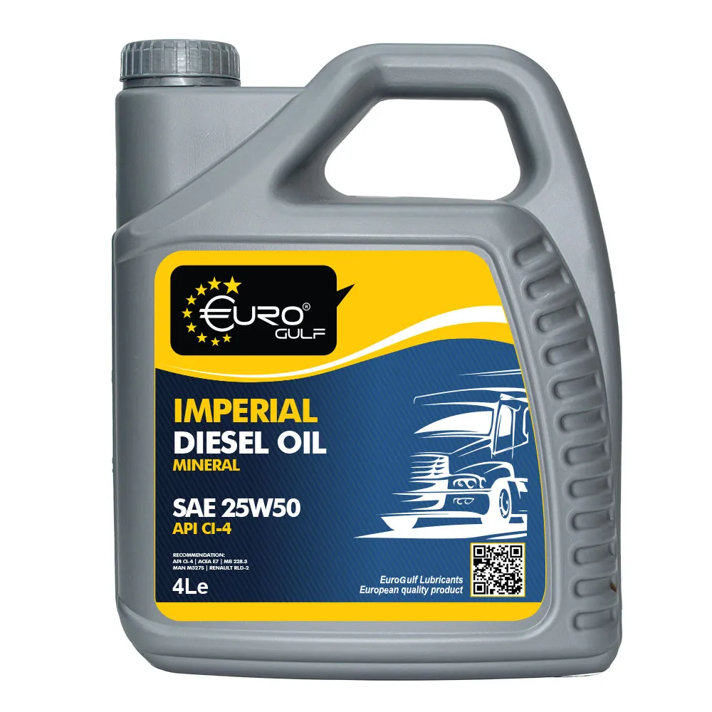 Euro Gulf Imperial Diesel Oil SAE 25W50 API CI-4 is a premium mineral-based diesel engine oil engineered to provide excellent lubrication and protection for heavy-duty diesel engines. It is formulated with advanced additive technology to ensure superior engine cleanliness, wear protection, and thermal stability under extreme conditions. This oil meets the requirements of modern diesel engines, including turbocharged and naturally aspirated models.Application: